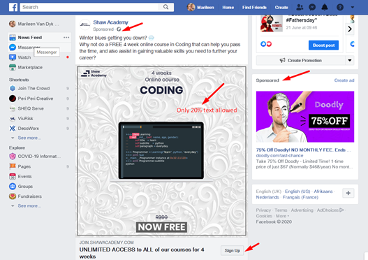Your images need to be striking and clear as there are only 20% text allowed on the image itself. It can be 1 static image, a slideshow of 3+ images or even a video.